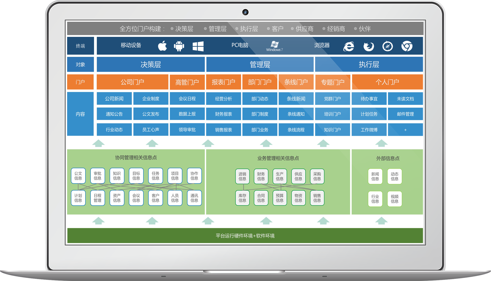 泛微門戶引擎平臺廣泛應(yīng)用于企業(yè)內(nèi)部員工(決策層/管理層/執(zhí)行層)及外部用戶(客戶/供應(yīng)商/經(jīng)銷商)的各類工作場景。