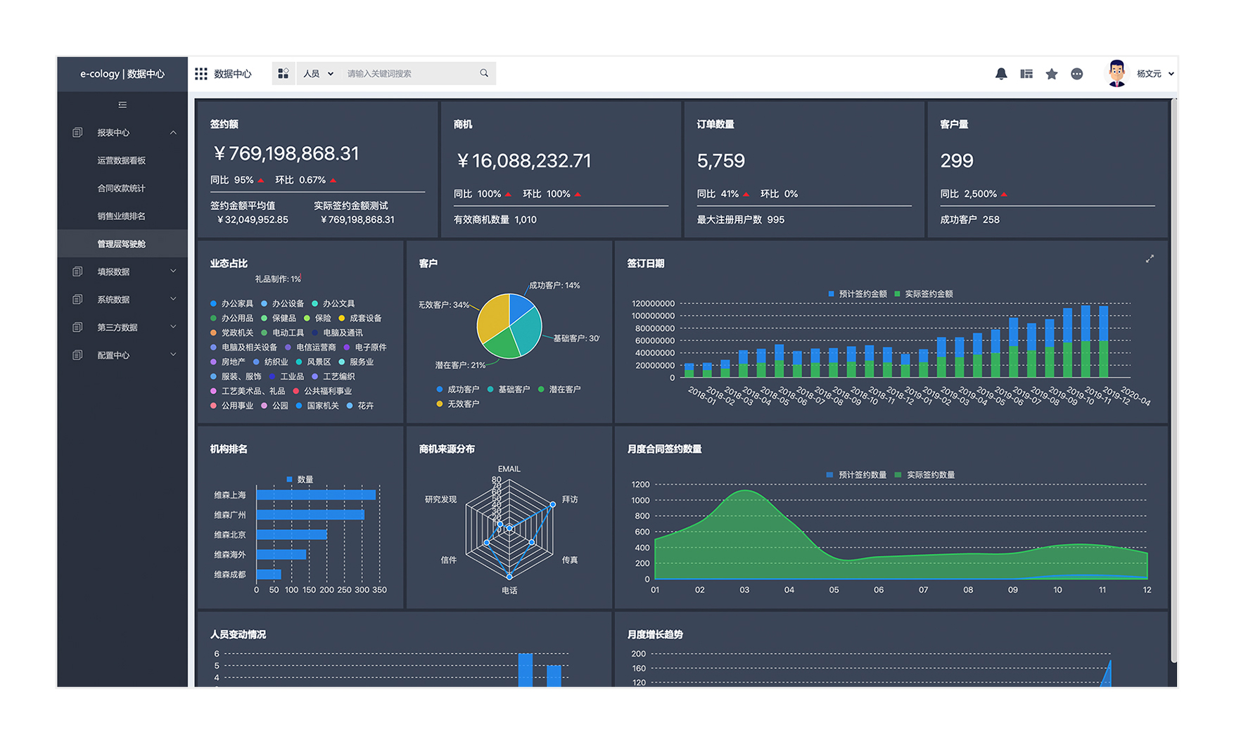 將領(lǐng)導(dǎo)關(guān)注的銷售、客戶、回款、項目進度、運營風(fēng)險等核心數(shù)據(jù),從各個應(yīng)用模塊或多個系統(tǒng)中抽取,通過一個窗口進行集中展現(xiàn)。支持PC、手機或大屏設(shè)備等不同終端。