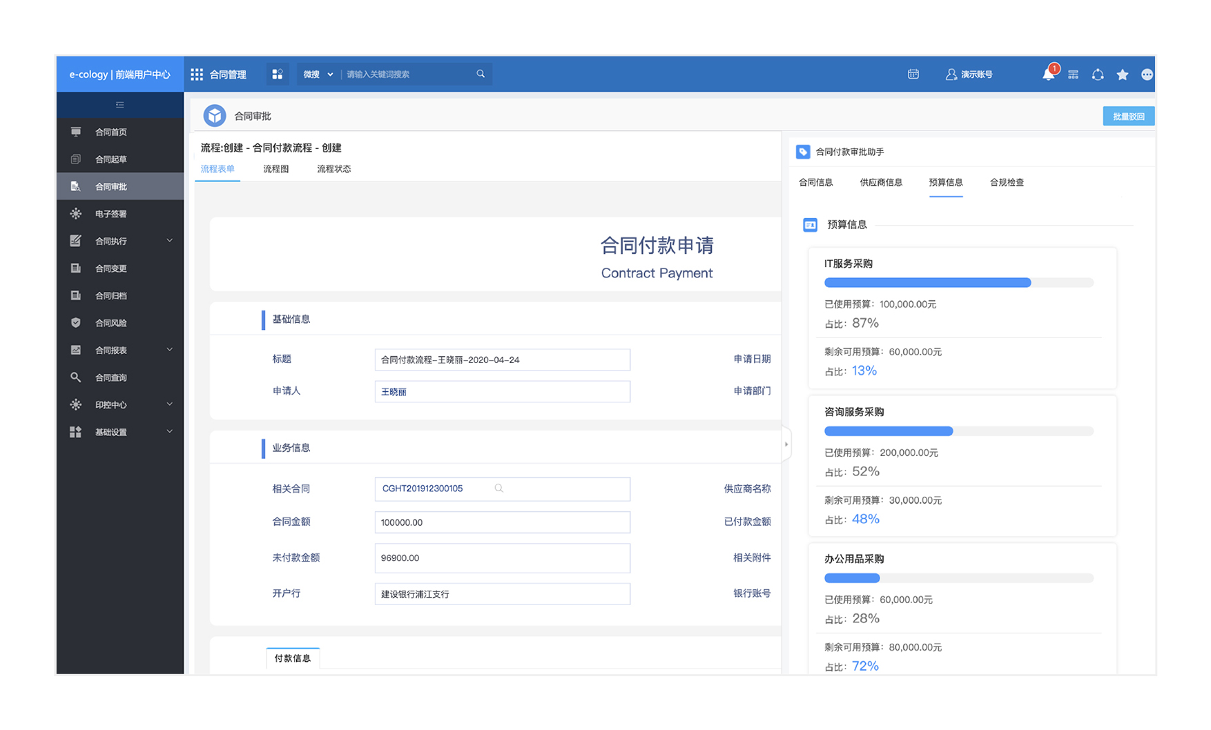 將合同模塊與數(shù)據(jù)中心關(guān)聯(lián),在付款時自動關(guān)聯(lián)組織預(yù)算,測算預(yù)算執(zhí)行風(fēng)險,并通過智能助手進行提醒,避免合同支付風(fēng)險。