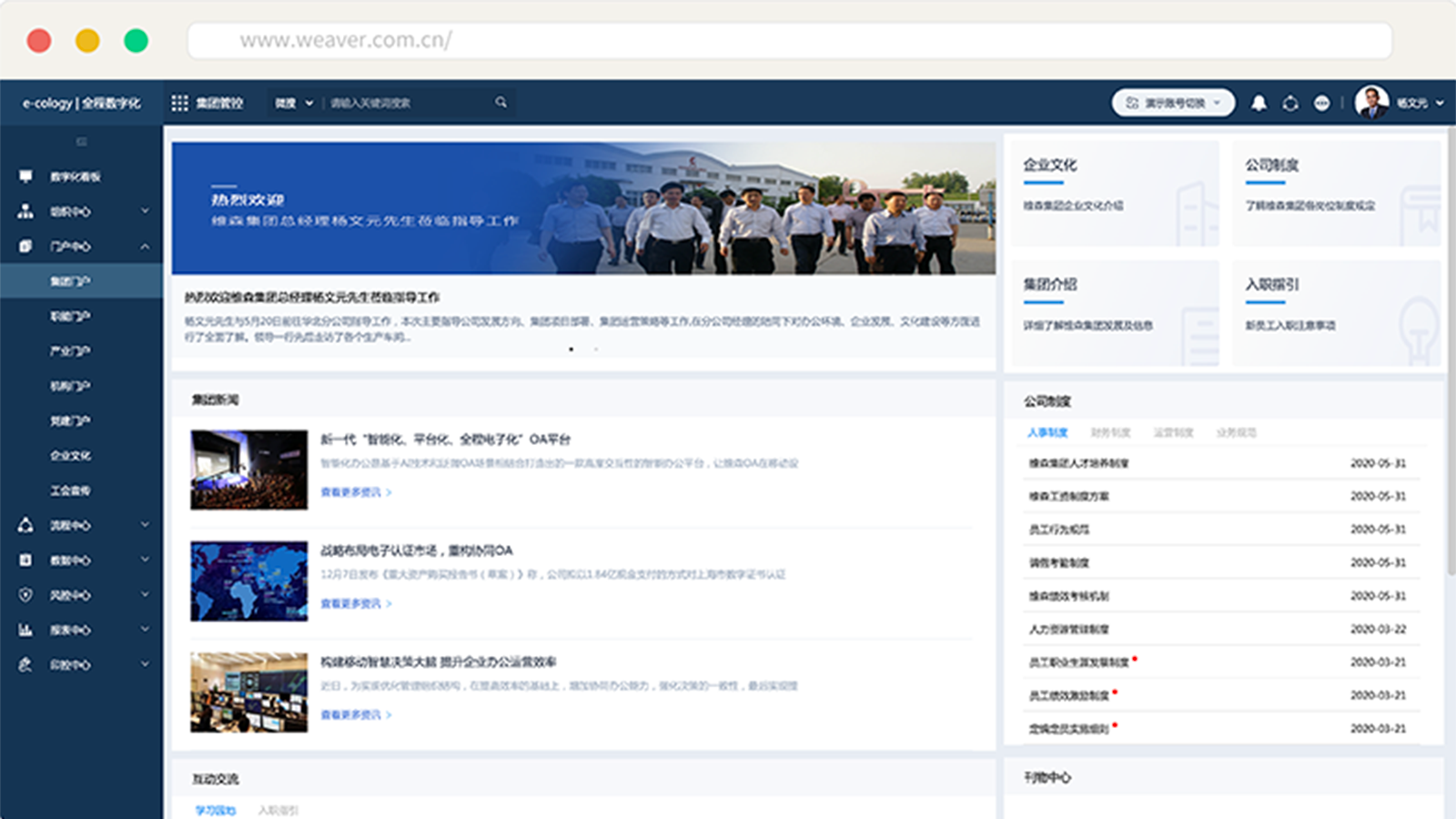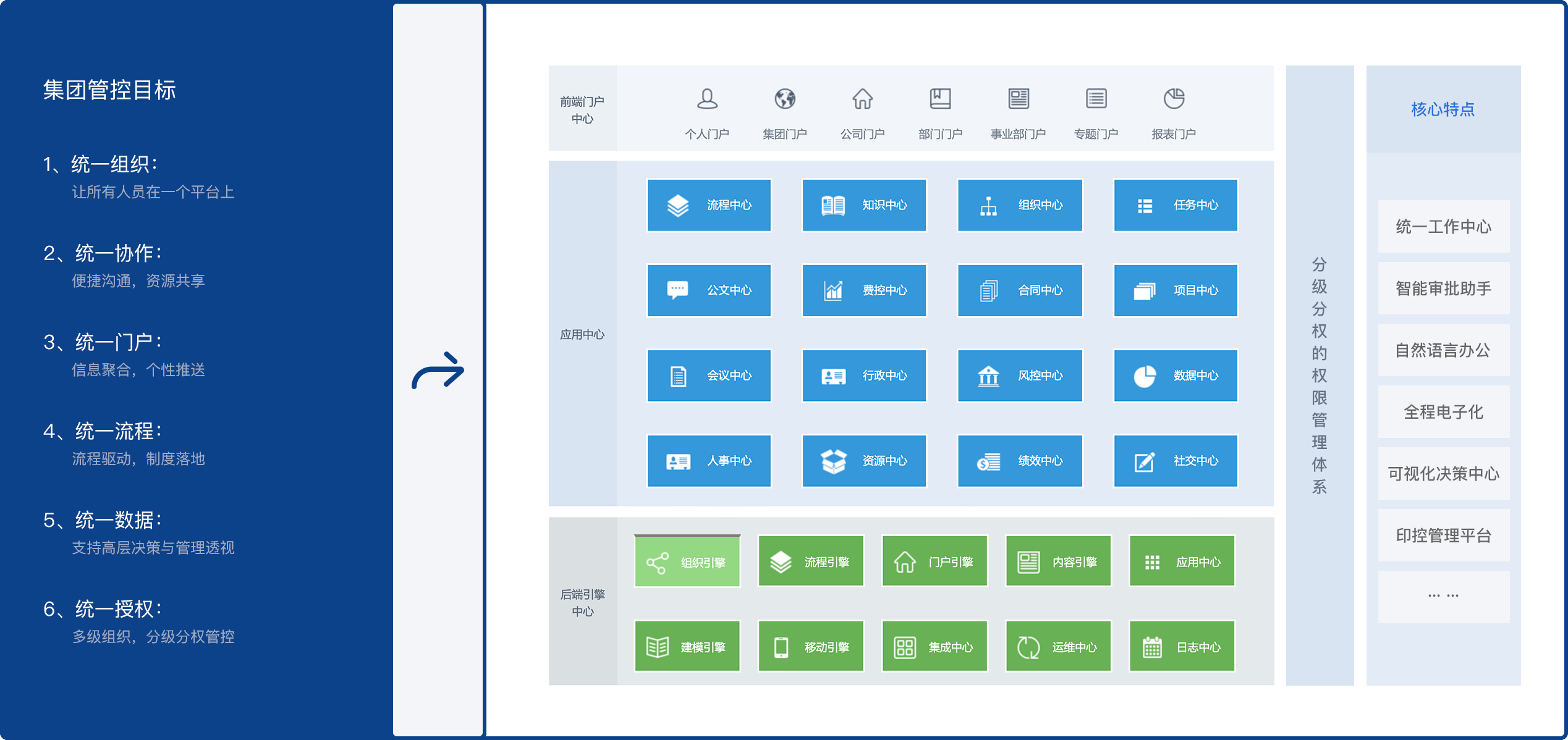 集團(tuán)門戶融合·實時信息交互·統(tǒng)一資源共享·風(fēng)險合規(guī)控制融合分級分權(quán)管理體系,融入集團(tuán)管控相關(guān)多種智能應(yīng)用
