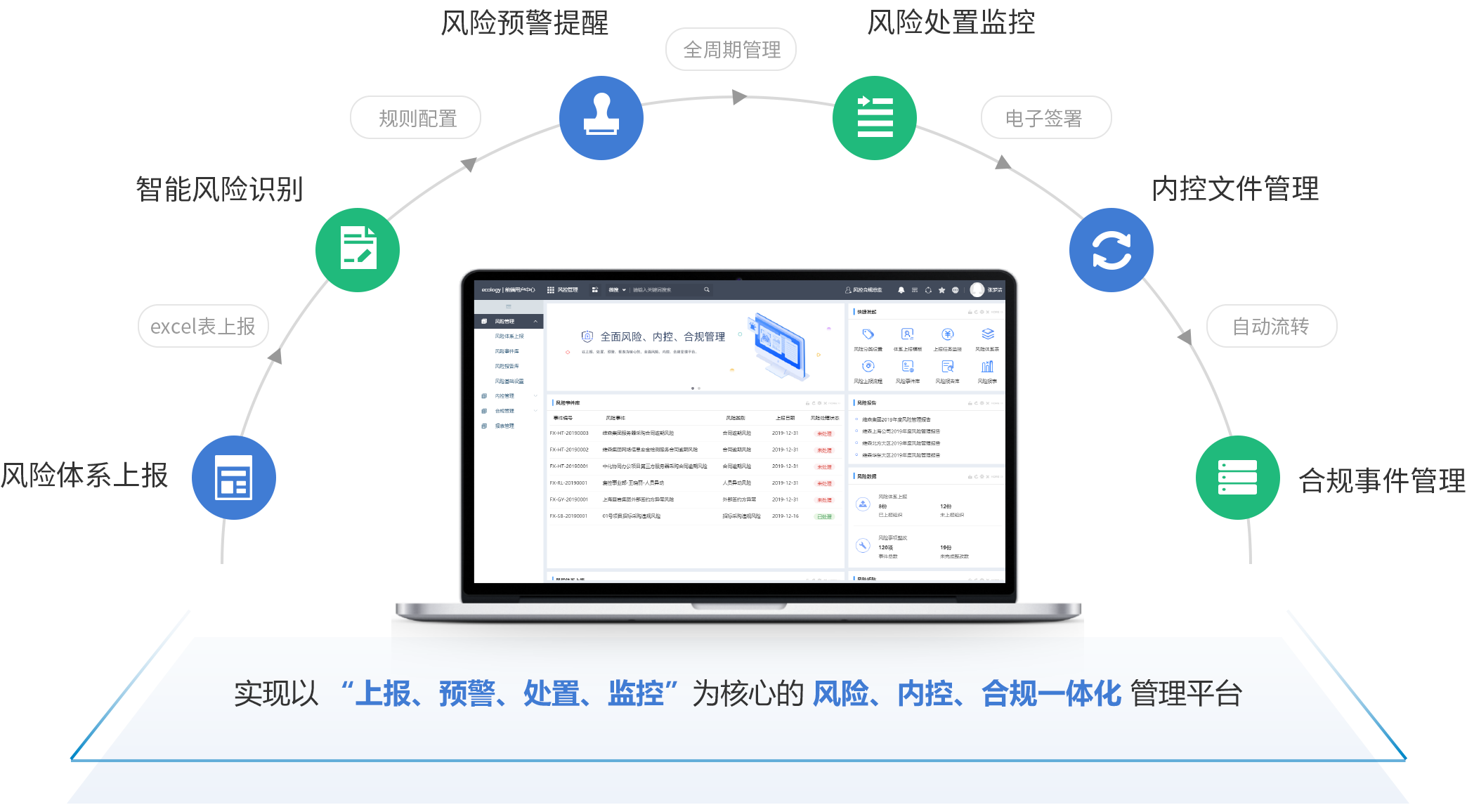無論是風(fēng)控體系上報,或是風(fēng)險處置、整改過程,都能可視化監(jiān)控,最終形成風(fēng)控分析報告和報表